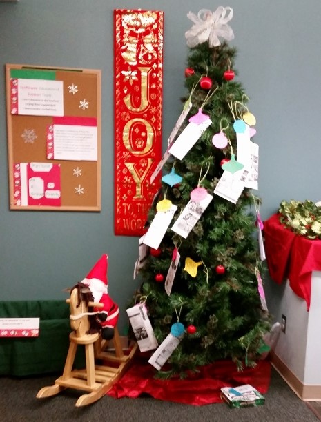 Teacher needs and wants for the classroom are attached to paper ornaments decorating a tree at Lenexa United Methodist Church, one of Sunflower Elementary’s school partners. The church also has adopted 15 families in need providing an Aldi’s gift card for food and two gift cards for each child for clothing and toys. In addition, they have raised $1,000 toward the expense of sending students to Camp Wildwood in the spring.