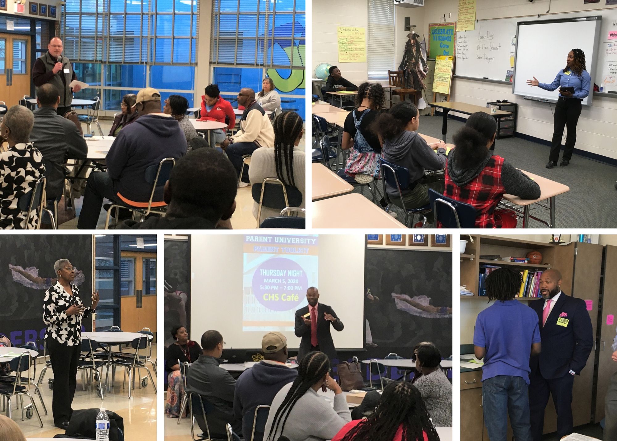 The following day, three Caring for Kids partners presented information about their services at Center High School’s monthly Parent University. Robert Mitchell with Edward Jones discussed financial planning to help parents save and prepare for college expenses. Rusty Menaugh presented on behalf of First Call regarding substance abuse awareness and prevention services. Lynnette Williams spoke about Women’s Employment Network’s services and workshops to help women gain employment. Parents enjoyed the opportunity to ask questions during the follow-up Q&A.